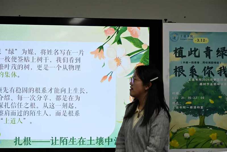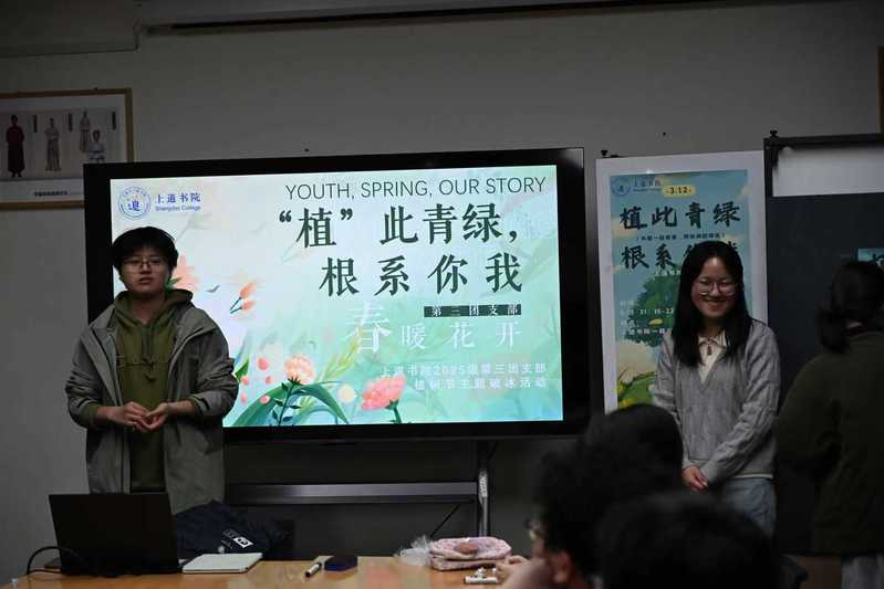 春风吐绿,草木萌发。3月12日晚,在第48个植树节到来之际,上道书院2025级本科生第三团支部在上道书院一楼学生活动空间举办“植此青绿,根系你我”植树节主题破冰活动。支部全体成员齐聚一堂,在轻松温馨的氛围中,以绿为媒,根系情谊,共话青春担当。活动由团支书李昂主持。